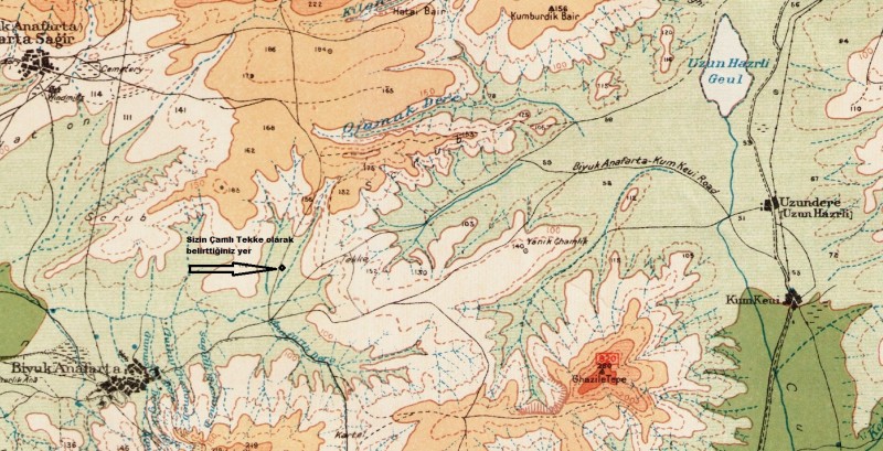 2. İngiliz 1/50.000 lik haritada yine tekke olarak yazılmıştır.Bu harita üzerine sizin Çamlı Tekke olarak belittiğiniz noktayıda işaretledim.