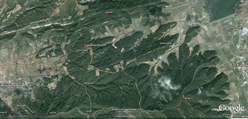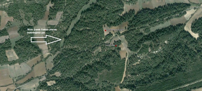 3.Çamlı Tekke ve yöresini gösteren uydu görüntüsü ve yakın görünümü de gönderiyorum. Yakın görünümde sizin Çamlı Tekke olarak belirttiğiniz yeri de işaretledim .  Yanında fotoğraf çektirdiğiniz büyük ağaçlarda görülüyor.