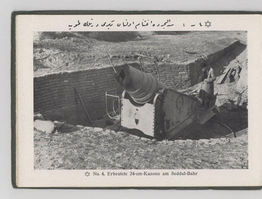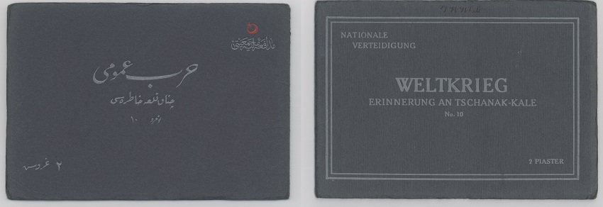 Resim 3.Burhan Felek’in , Çanakkale Cephesi’ni çektiği fotoğrafların yayınlandığı fotoğraf albümleri Harb-i Umumi Panoraması’nın 10. Sayısının Osmanlıca ve Almanca kapakları. Osmanlıca kapakta “Sağ üstte: Müdafaa-i Milliye Cemiyeti, Ortada: Harb-i Umumi Panoraması Çanakkale hatırası Numara( Sayı) 10, Sol altta: 3 kuruş.” yazmakta. (Tercüme için Muzaffer Albayrak’a teşekkürler)