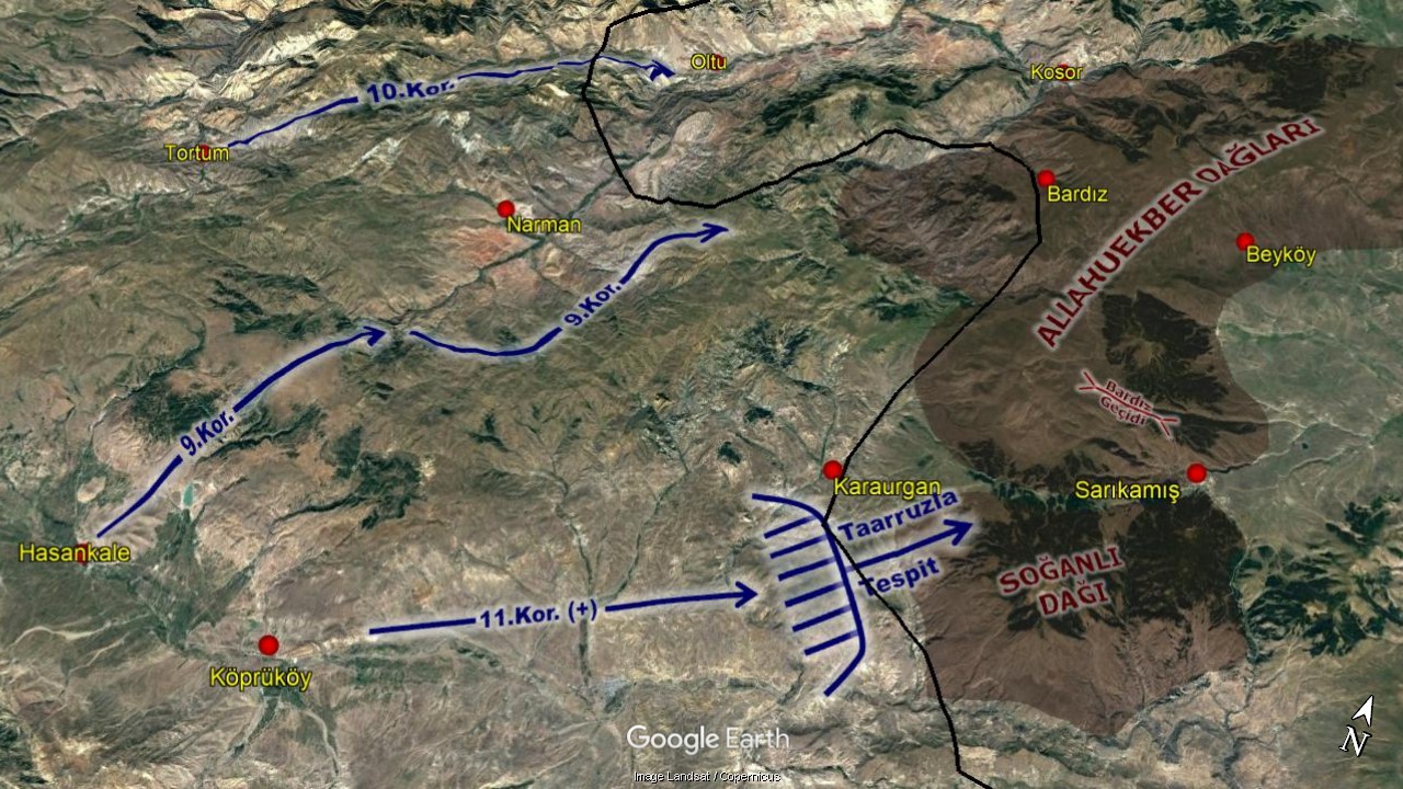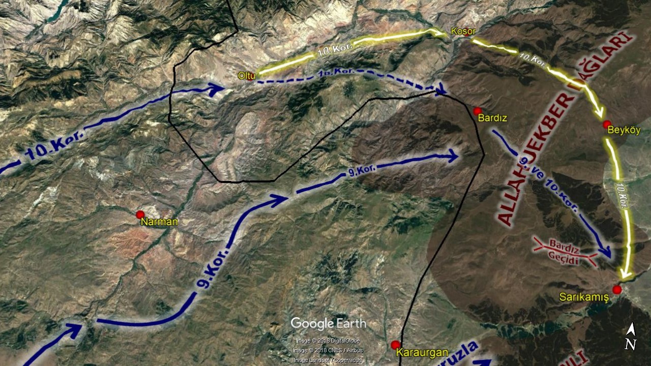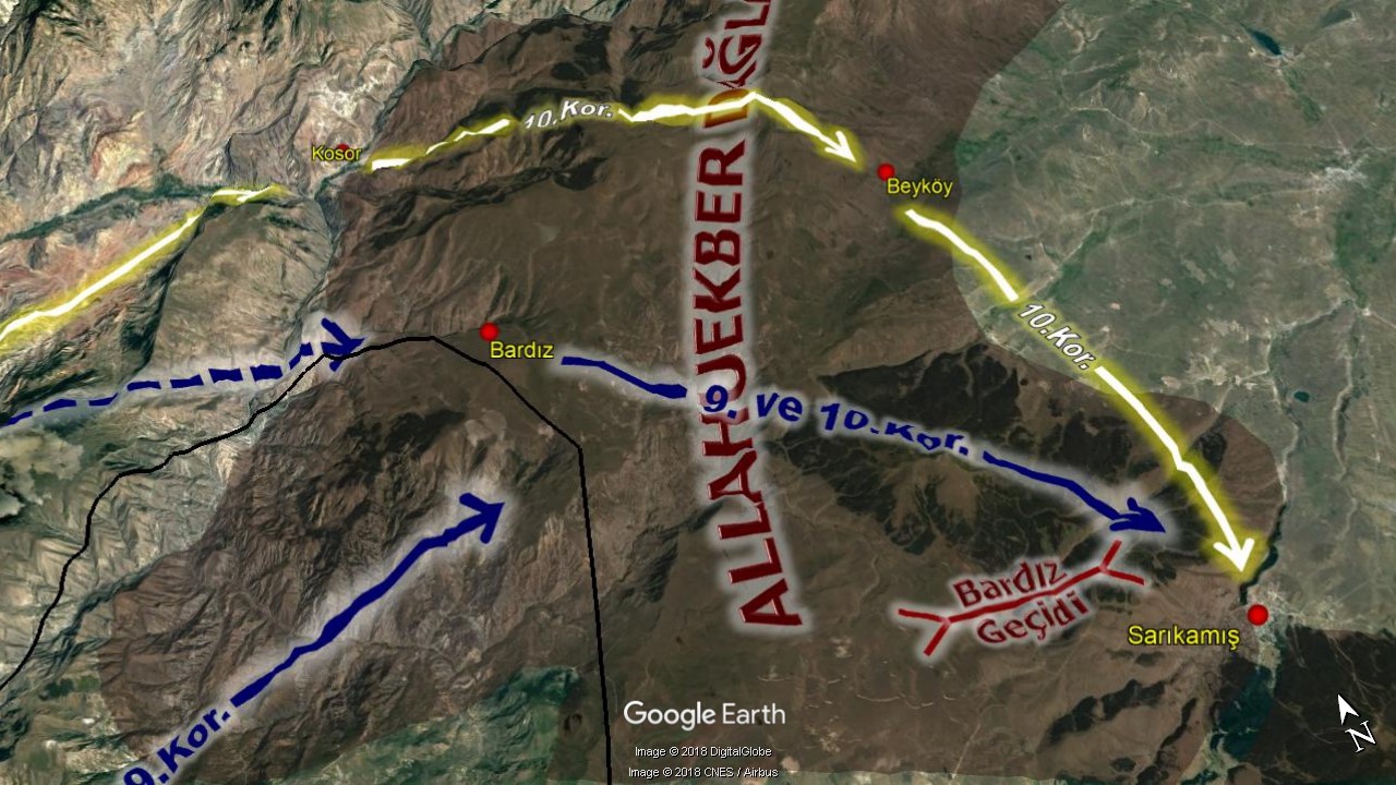 Sarıkamış Harekâtına facia sıfatını kazandıran asıl gelişme 10.Kolordu bölgesinde olmuştur. Harekât planına göre Oltu’dan Bardız’a ulaşması ve burada 9.Kolordu ile birleşerek Sarıkamış’a ilerlemesi gereken 10.Kolordu, Komutanı Hafız Hakkı Bey’in plan dışına çıkması ve gereksiz yere Rusların Oltu müfrezesini Kosor Boğazı içlerine doğru takip etmesiyle bir çıkamza girer. Bu takip, kolordunun artık Bardız’a yönelmesine imkan vermeyecek şekilde kolorduyu Ardahan istikametine kanalize etmiş ve Bardız’da 9.Kolordu ile birleşemeyecek duruma gelmiştir. Ancak her halükarda 10.Kolordunun Sarıkamış’a ulaşma sorumluluğu bulunduğundan, cebrî yürüyüşe hiç de uygun olmayacak şekilde Kosor’dan Beyköy’e Allahuekber Dağlarını aşmak durumunda kalmıştır. (Resim-5)