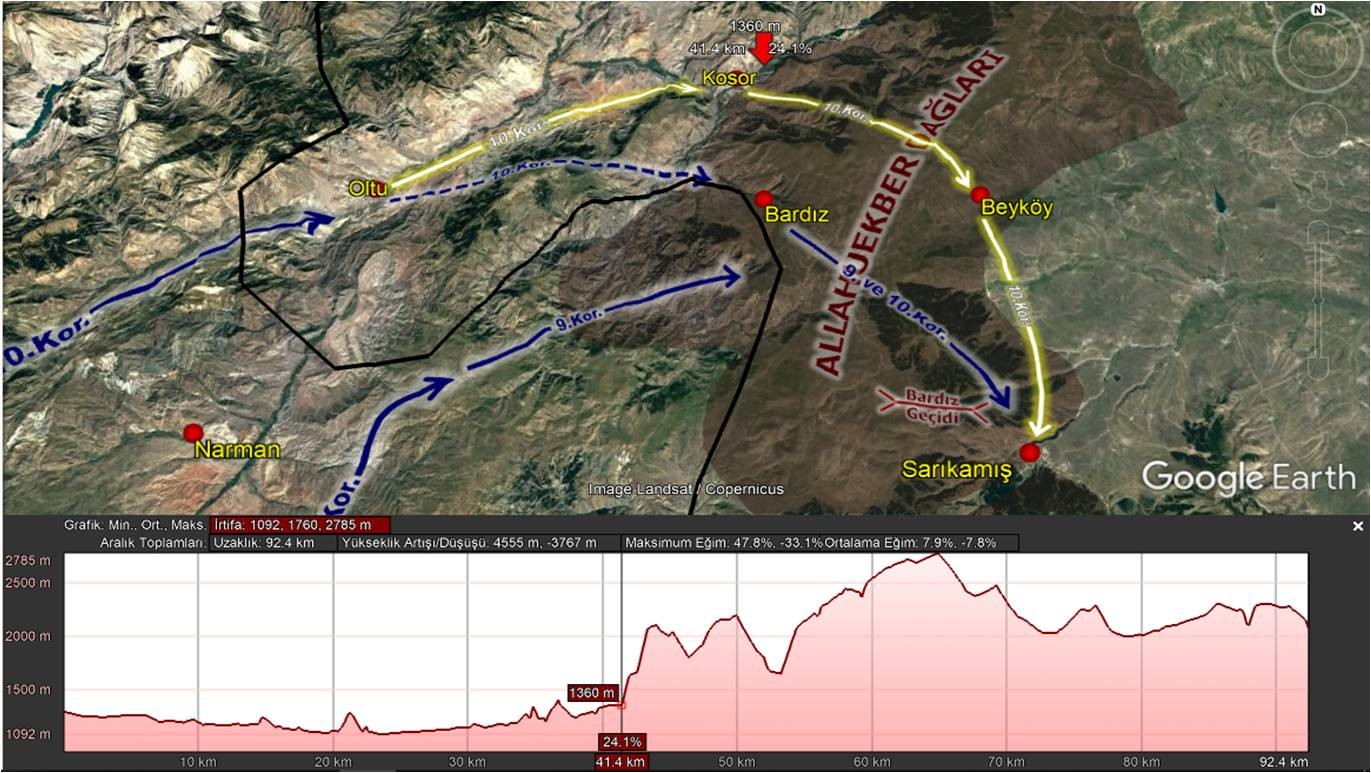 10.Kolordunun Oltu’dan Sarıkamış’a olan yürüyüş (parlak sarı oklarla) kesiti Resim-6’da görülmektedir. Güzergâh incelendiğinde, ortalama eğimin %8 ile normal olduğu, yer yer azami eğim ortalamasının %45 değerine çıktığı, -ki bu eğim oranı çok fazla olup birliği durdurucu ve yön değiştirici etki gösterir- ters kompartıman diyebileceğimiz “yükseklik artış düşüş ortalaması”nın ise yaklaşık 4000 metre olup birliklerin bütün enerjisini öldürücü bir etki oluşturduğunu görebiliyoruz. Birlikler 1250 metreden 3100 metre rakıma kadar tırmanıp tekrar 2000 metreye inmek zorunda kalmışlardır.