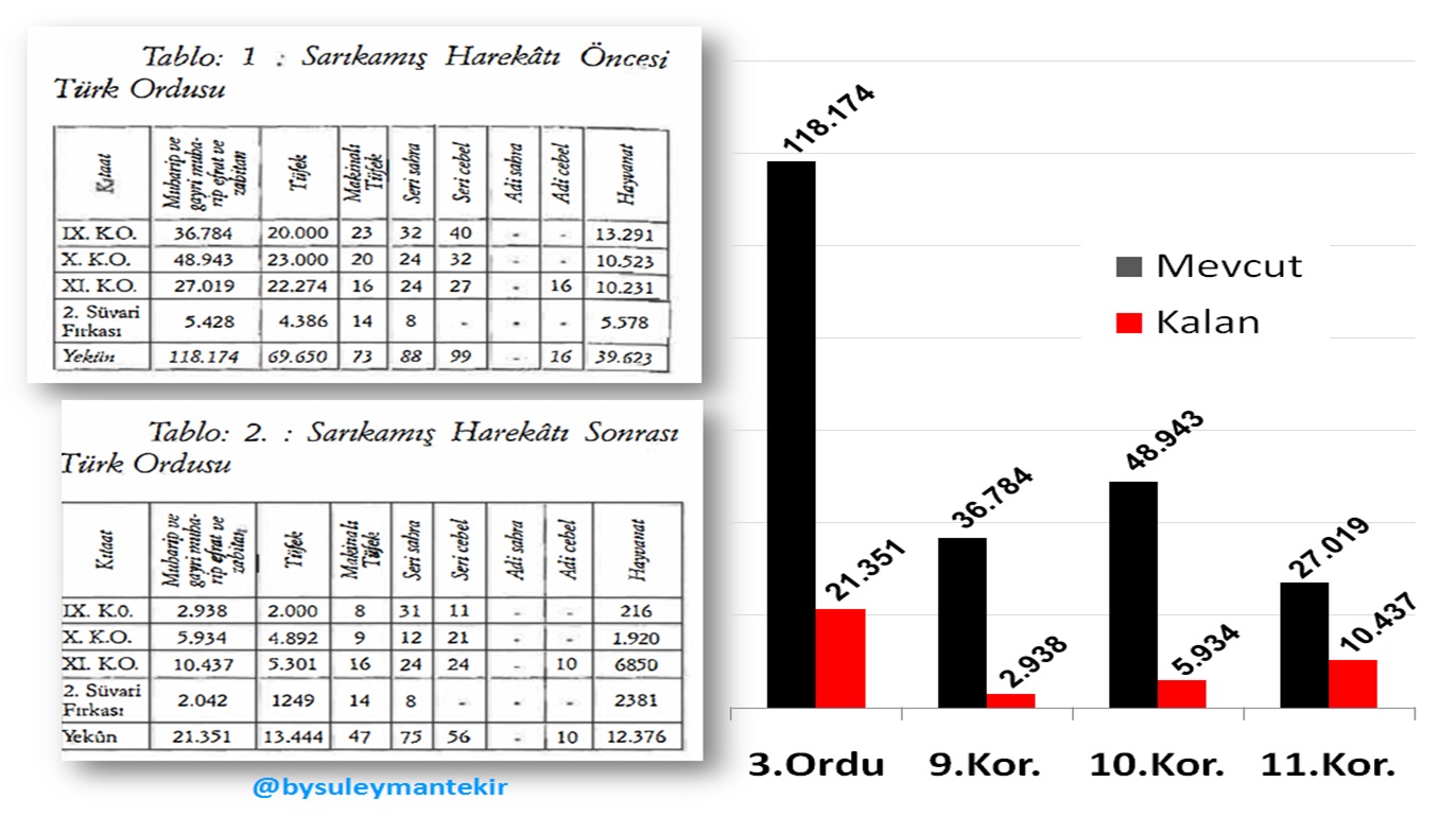 Harekât esnasında donarak şehit olan Mehmetçik sayısı net değildir ve farklı rakamlar zikredilmektedir. Birliklerin azalan mevcutlarına sebep sadece donmalar değil, tahliye edilen kayıt dışı yaralılar, esirler, kaçaklar ve döküntüler de dâhildir. Bir fikir vermesi açısından harekât öncesi ve sonrası 3.Ordunun birlik mevcutlarını Süleyman Tekir’in “Sarıkamış Harekâtı’nda Türk ve Rus Kayıpları” isimli makalesinden görelim. (Resim-8)